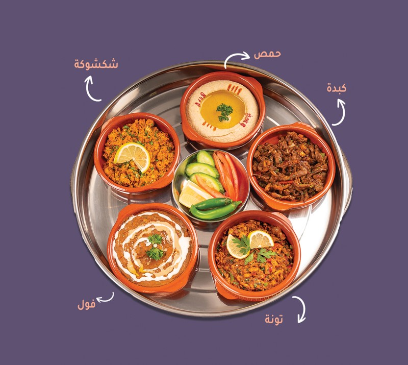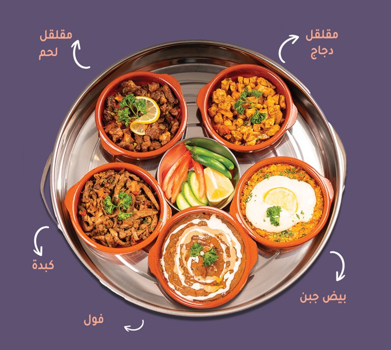 (220 سعرة حرارية)مقلقل لحم، مقلقل دجاج، كبدة غنم طازج، بيض جبن، فول، اضافة سلطة